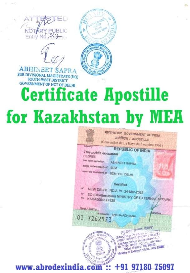 We, Abrodex Consultancy Services, complete Certificate Apostille for Kazakhstan. The detail process, time requirement, charges etc. to get an Apostille Stamp from MEA of a personal document and /or Educational Certificate in India is mentioned hereunder. All the process is mentioned hereunder is described as per the Ministry of External Affairs (MEA), Government of India guidelines. We are one of the authorized agencies to complete any kind of Certificate Apostille for Kazakhstan in India.