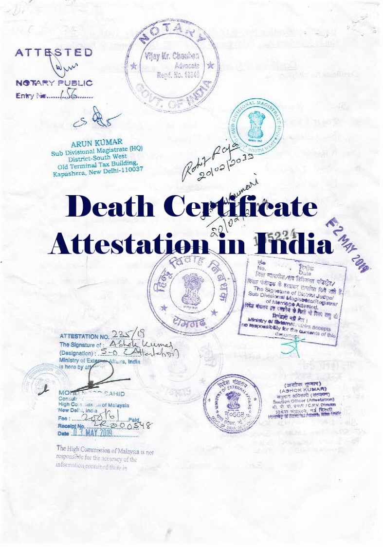 The Attestation of Death Certificate from Home Department / GAD / RAC is a very much time consuming as well as hectic process. The process of Death Certificate Attestation, prior Ministry of External Affairs (MEA) Certification, is different for separate states. To keep the points in focus, the MEA has given the special authority to some of the selected Sub Divisional Magistrates (SDM), Govt. of NCT-Delhi to attest the documents prior MEA, in special cases.