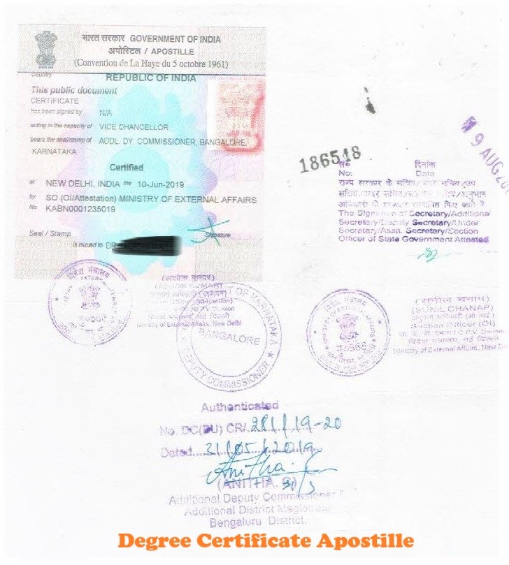 The MEA is the competent authority to complete the Degree Certificate Apostille for USA after some mandatory authentication and attestation. The Degree Certificate is treated as educational document and may be issued from Govt. as well as private organization in India. The detail process of Degree Certificate Apostille for USA in India is given under.