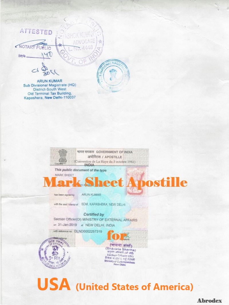 Abrodex Consultancy services is best service provider for Mark Sheet Apostille for USA in India. We complete Mark Sheet Apostille from Ministry of External Affairs (MEA), Govt. of India after the Attestation of Ministry of Education /HRD or Higher Education Department of the State. We also complete the Mark Sheet Apostille for USA in India through alternative methods. Please get in touch with us and enjoy the first-rate services.