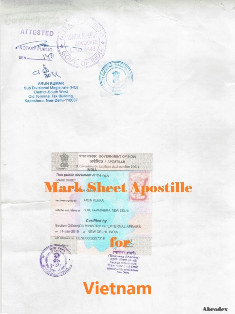 Abrodex Consultancy services is best service provider for Mark Sheet Apostille for Vietnam in India. We complete Mark Sheet Apostille from Ministry of External Affairs (MEA), Govt. of India after the Attestation of Ministry of Education /HRD or Higher Education Department of the State. We also complete the Mark Sheet Apostille for Vietnam in India through alternative methods. Please get in touch with us and enjoy the first-rate services.