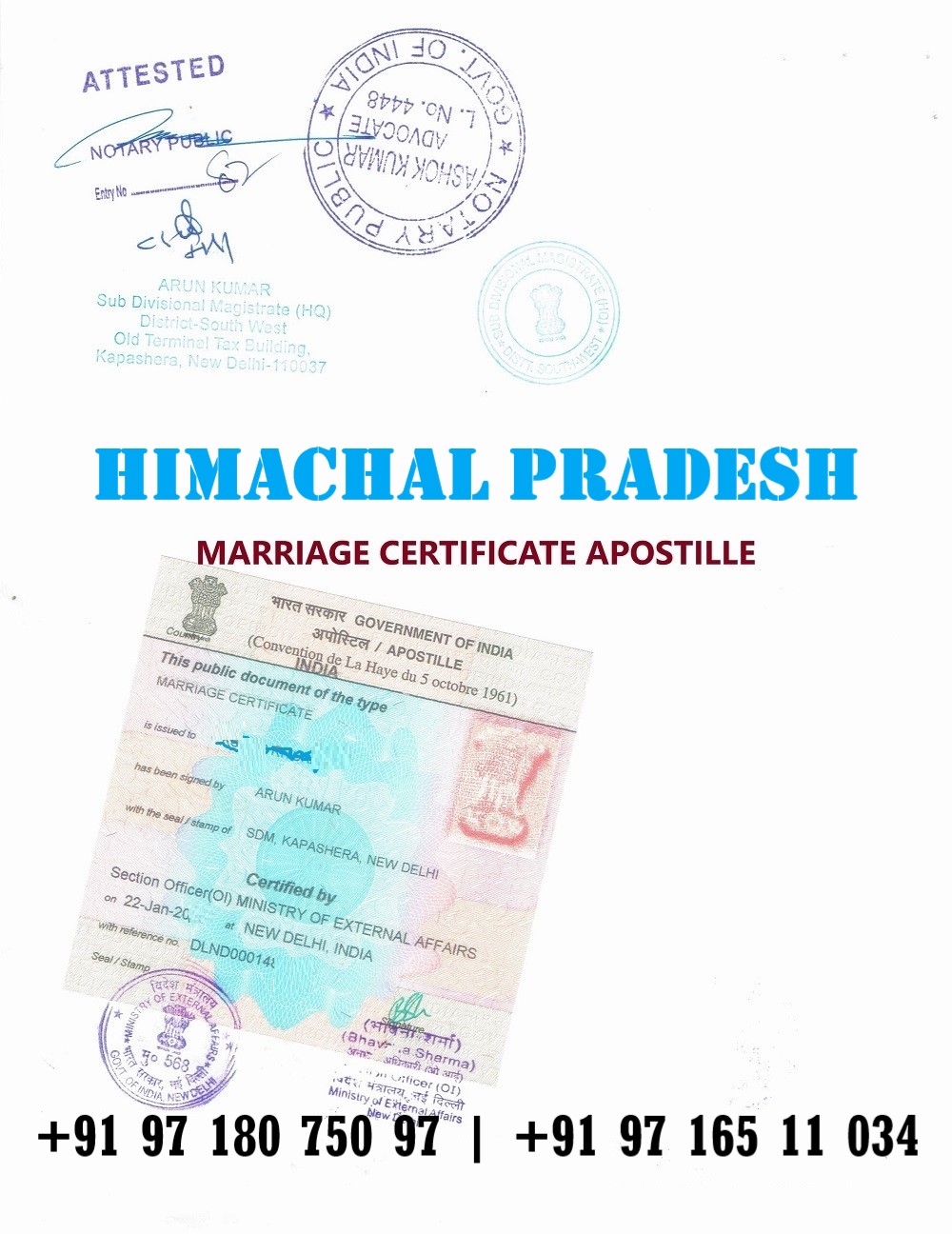 Typically, you will need: • Original marriage certificate issued by Himachal Pradesh registrar. • Valid passport-copy of the applicant/spouse (first & last pages). Photo identity proof/address proof (Aadhaar, PAN, etc). • Passport size photographs (if required by service). • State authentication proof (seal/signature from Himachal Pradesh Home Department/SDM). • Any affidavit or supporting document if the certificate was issued after significant delay.