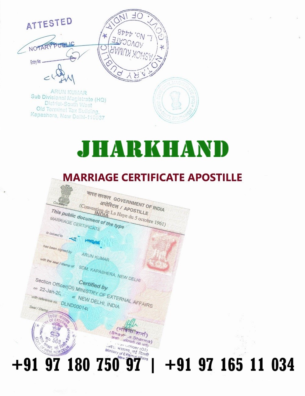 Typically, you will need: • Original marriage certificate issued by Jharkhand registrar. • Valid passport-copy of the applicant/spouse (first & last pages). Photo identity proof/address proof (Aadhaar, PAN, etc). • Passport size photographs (if required by service). • State authentication proof (seal/signature from Jharkhand Home Department/SDM). • Any affidavit or supporting document if the certificate was issued after significant delay.