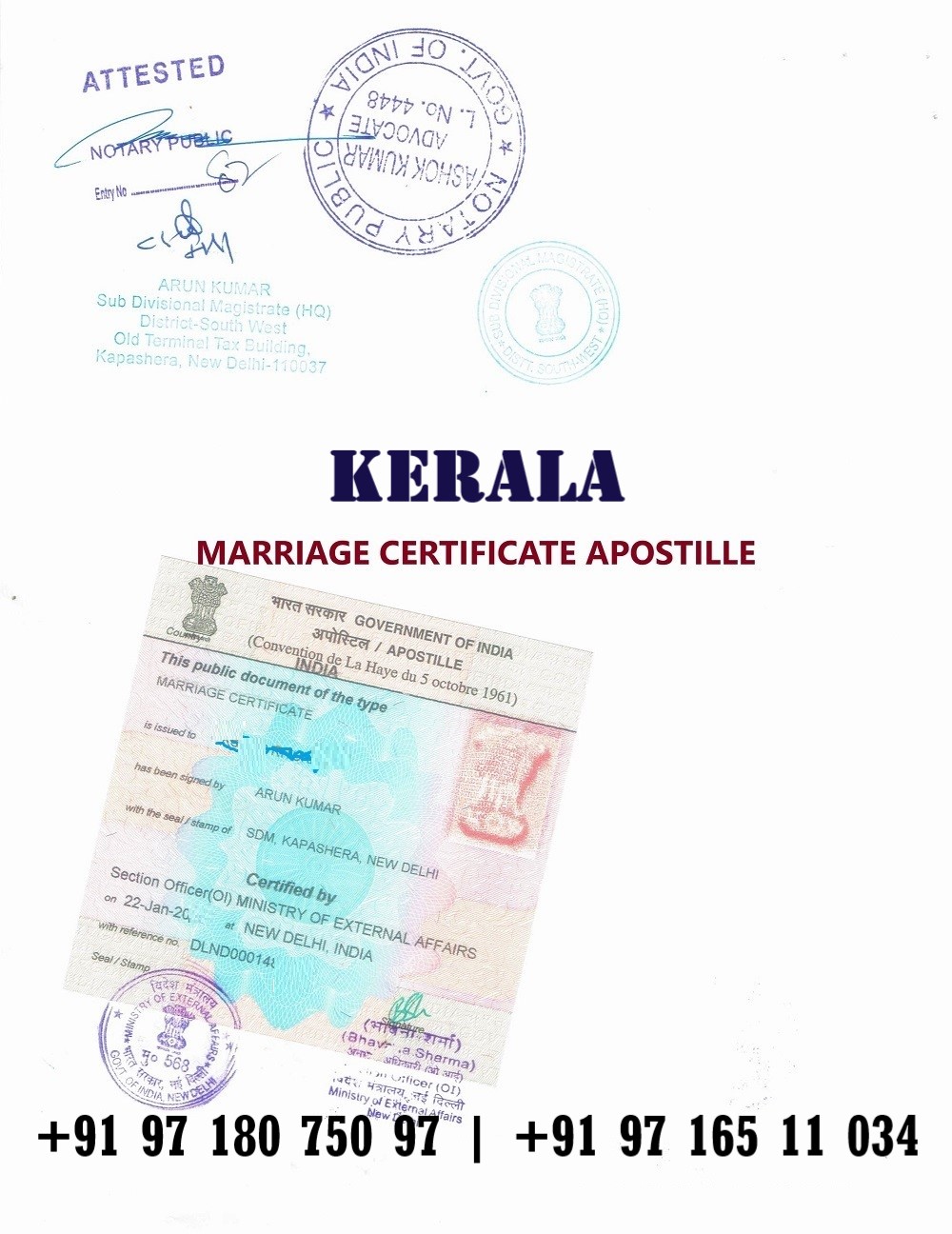 Typically, you will need: • Original marriage certificate issued by Kerala registrar. • Valid passport-copy of the applicant/spouse (first & last pages). Photo identity proof/address proof (Aadhaar, PAN, etc). • Passport size photographs (if required by service). • State authentication proof (seal/signature from Kerala Home Department/SDM). • Any affidavit or supporting document if the certificate was issued after significant delay.