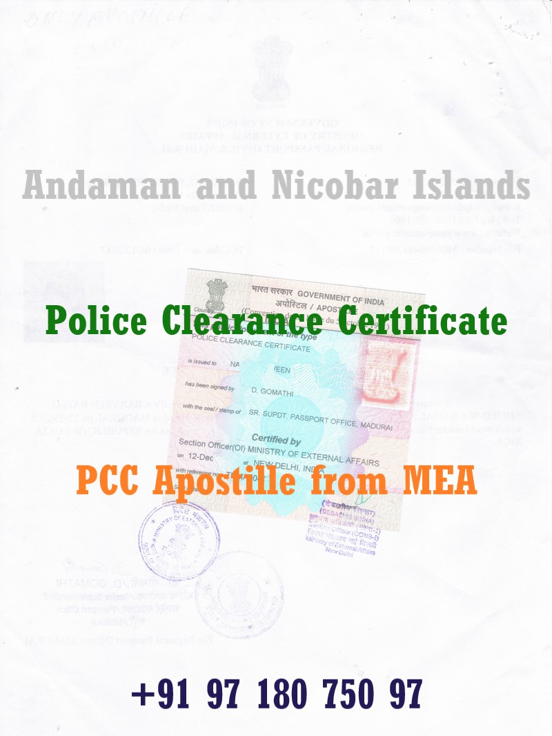 A Police Clearance Certificate (PCC) also known as No Criminal Record Certificate issued in Andaman & Nicobar Islands (Andaman & Nicobar Islands) is an important document required for immigration, employment abroad, long-term visas, residency permits, work permits, global background verification, and various foreign legal processes. To be legally accepted outside India, a Andaman & Nicobar Islands-issued PCC must be Apostilled by the Ministry of External Affairs (MEA), Govt. of India.