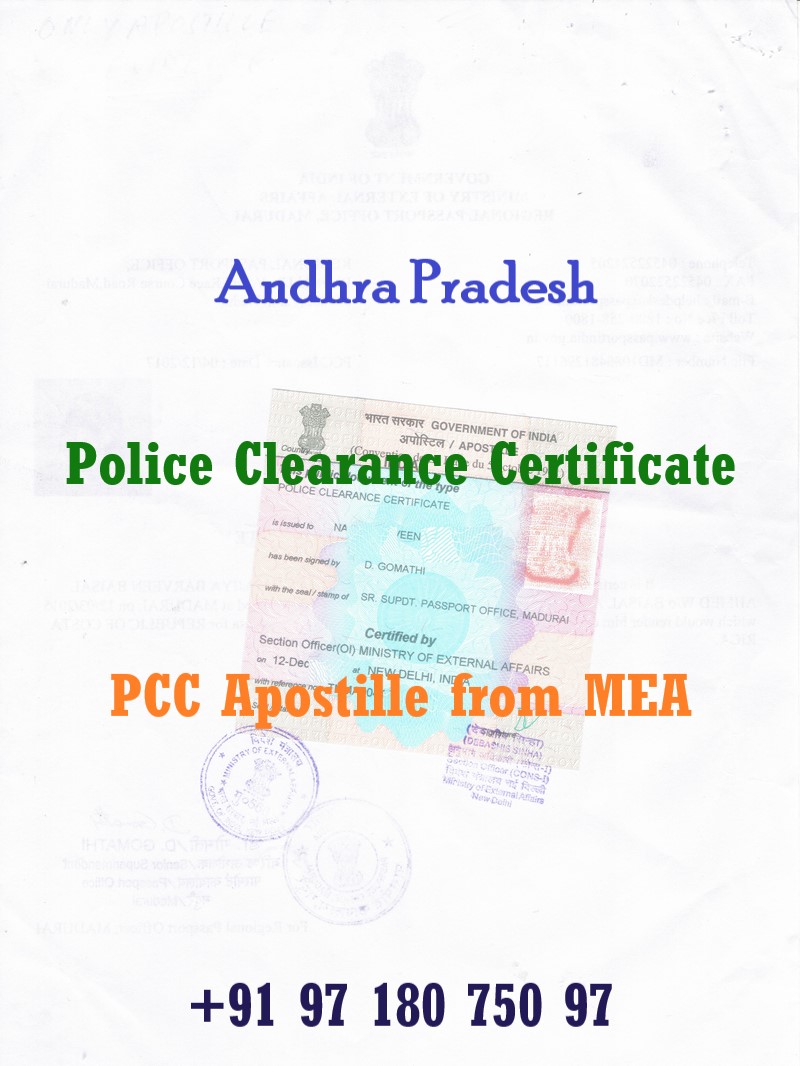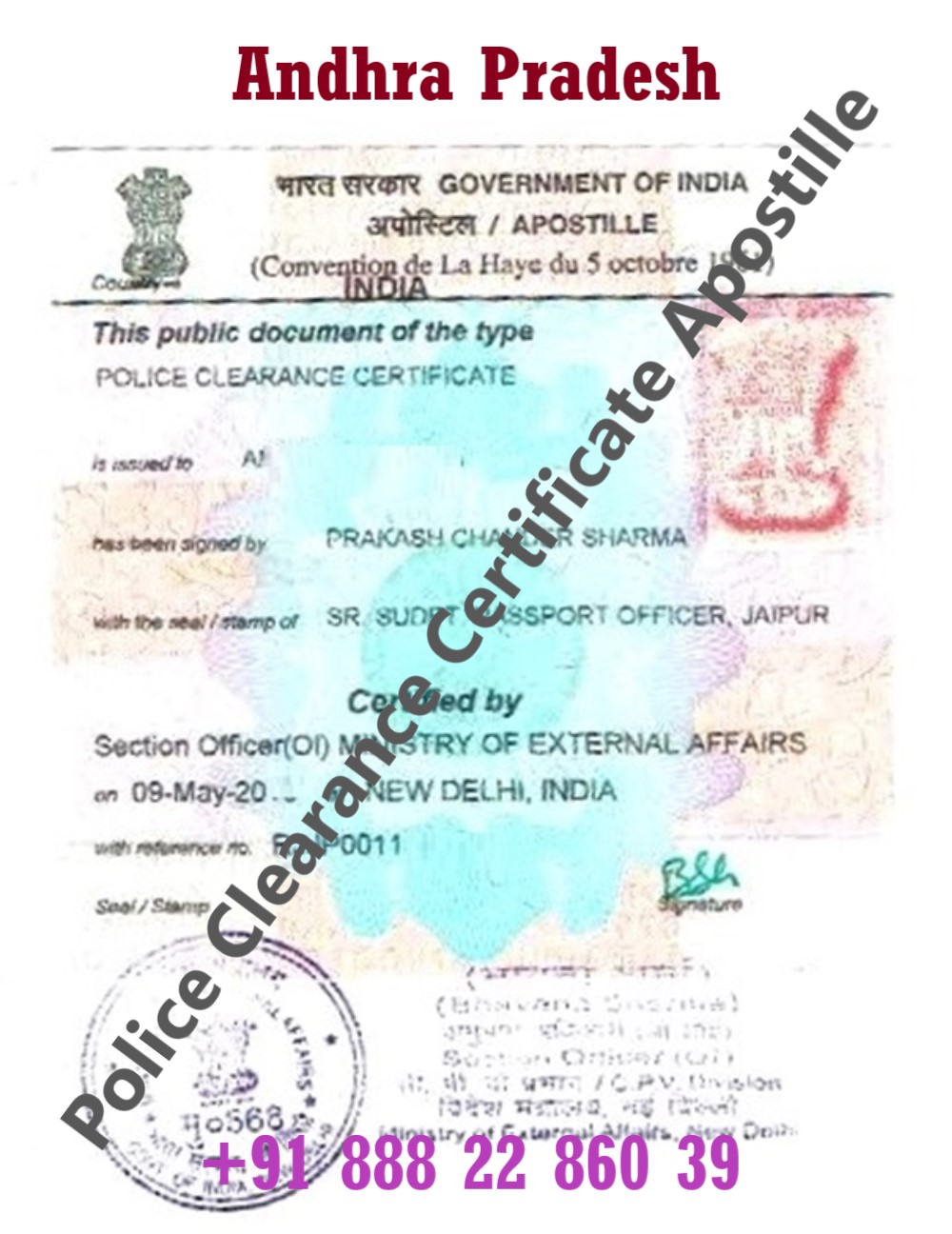 A Police Clearance Certificate (PCC) also known as No Criminal Record Certificate issued in Andhra Pradesh (Andhra Pradesh) is an important document required for immigration, employment abroad, long-term visas, residency permits, work permits, global background verification, and various foreign legal processes. To be legally accepted outside India, a Andhra Pradesh-issued PCC must be Apostilled by the Ministry of External Affairs (MEA), Govt. of India.