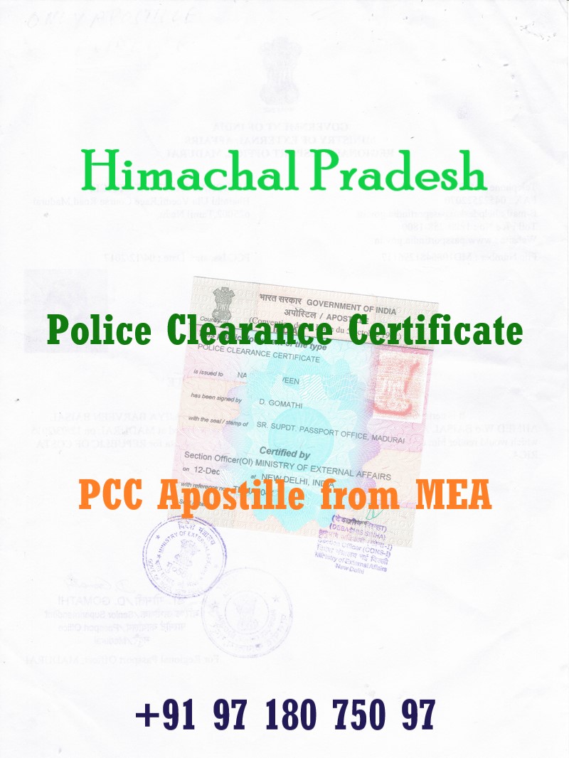A Police Clearance Certificate (PCC) also known as No Criminal Record Certificate issued in Himachal Pradesh (Himachal Pradesh) is an important document required for immigration, employment abroad, long-term visas, residency permits, work permits, global background verification, and various foreign legal processes. To be legally accepted outside India, a Himachal Pradesh-issued PCC must be Apostilled by the Ministry of External Affairs (MEA), Govt. of India.