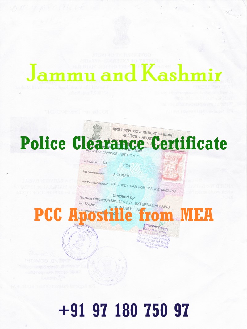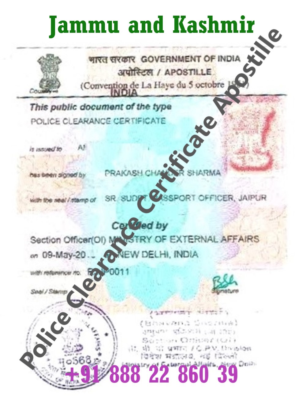 A Police Clearance Certificate (PCC) also known as No Criminal Record Certificate issued in Jammu and Kashmir (Jammu and Kashmir) is an important document required for immigration, employment abroad, long-term visas, residency permits, work permits, global background verification, and various foreign legal processes. To be legally accepted outside India, a Jammu and Kashmir-issued PCC must be Apostilled by the Ministry of External Affairs (MEA), Govt. of India.