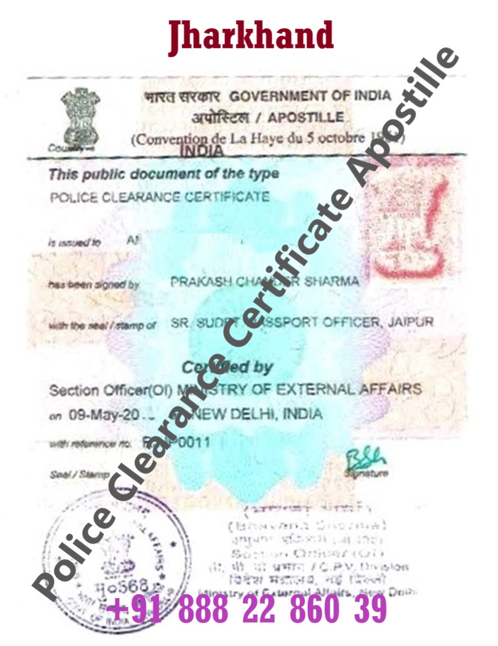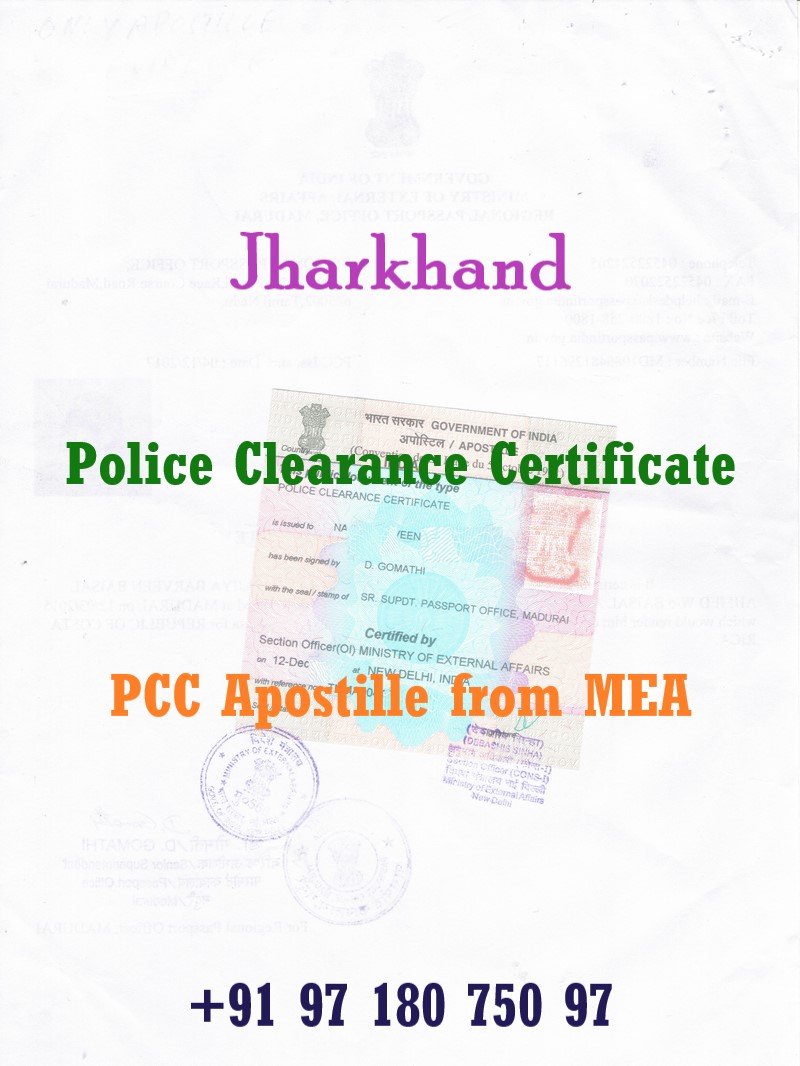 A Police Clearance Certificate (PCC) also known as No Criminal Record Certificate issued in Jharkhand (Jharkhand) is an important document required for immigration, employment abroad, long-term visas, residency permits, work permits, global background verification, and various foreign legal processes. To be legally accepted outside India, a Jharkhand-issued PCC must be Apostilled by the Ministry of External Affairs (MEA), Govt. of India.
