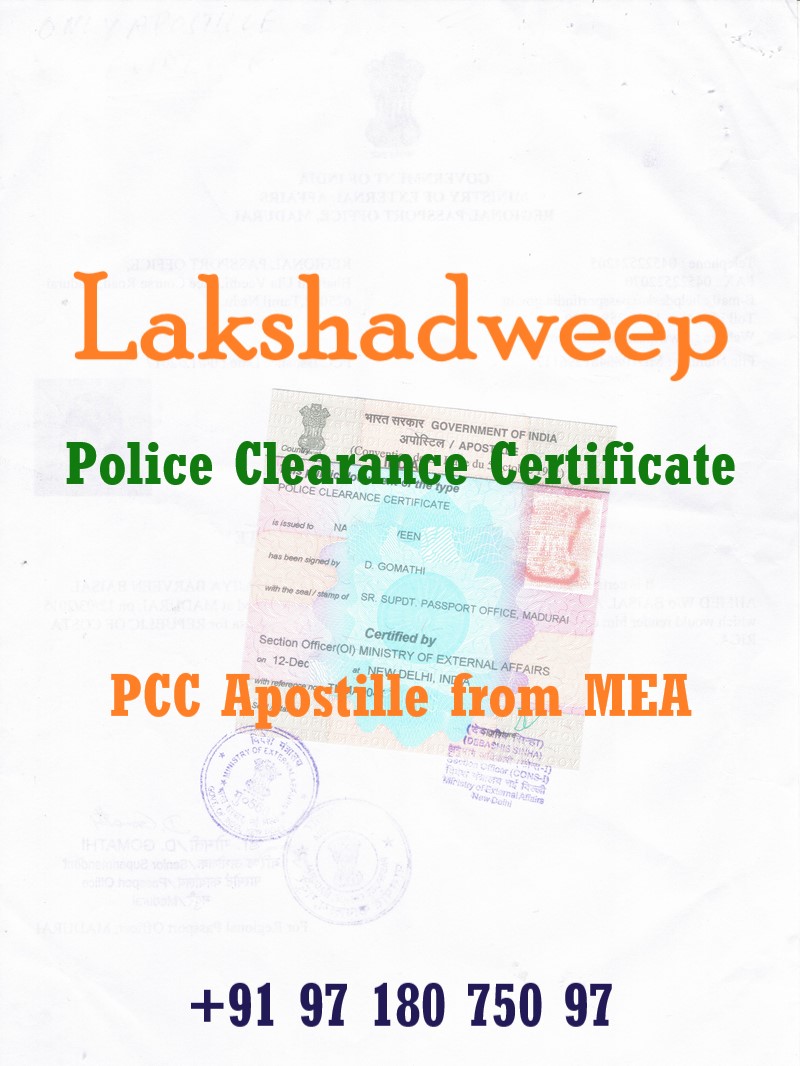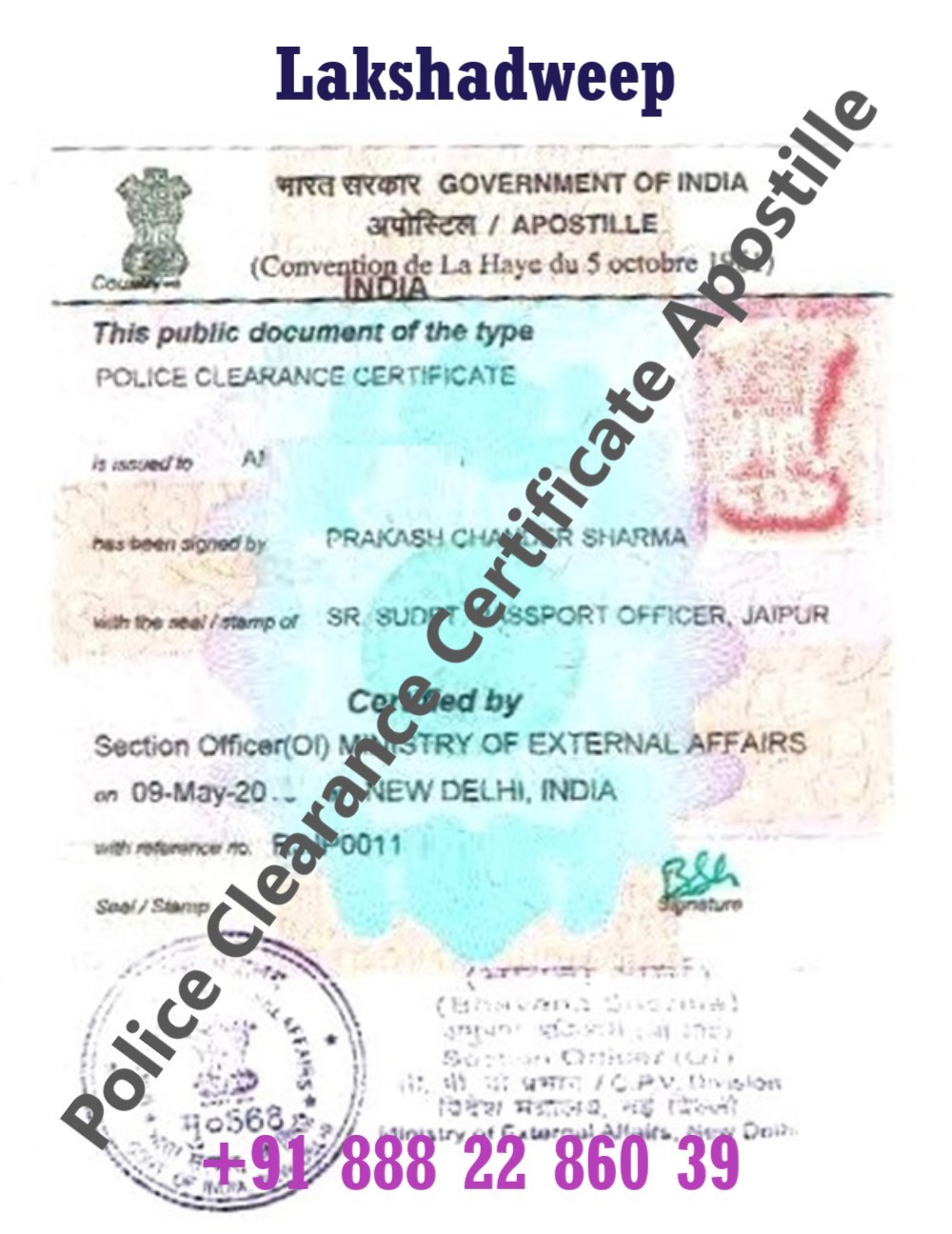 A Police Clearance Certificate (PCC) also known as No Criminal Record Certificate issued in Lakshadweep (Lakshadweep) is an important document required for immigration, employment abroad, long-term visas, residency permits, work permits, global background verification, and various foreign legal processes. To be legally accepted outside India, a Lakshadweep-issued PCC must be Apostilled by the Ministry of External Affairs (MEA), Govt. of India.