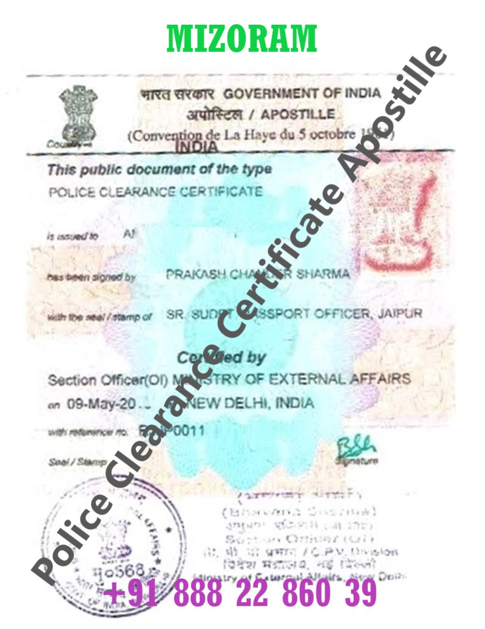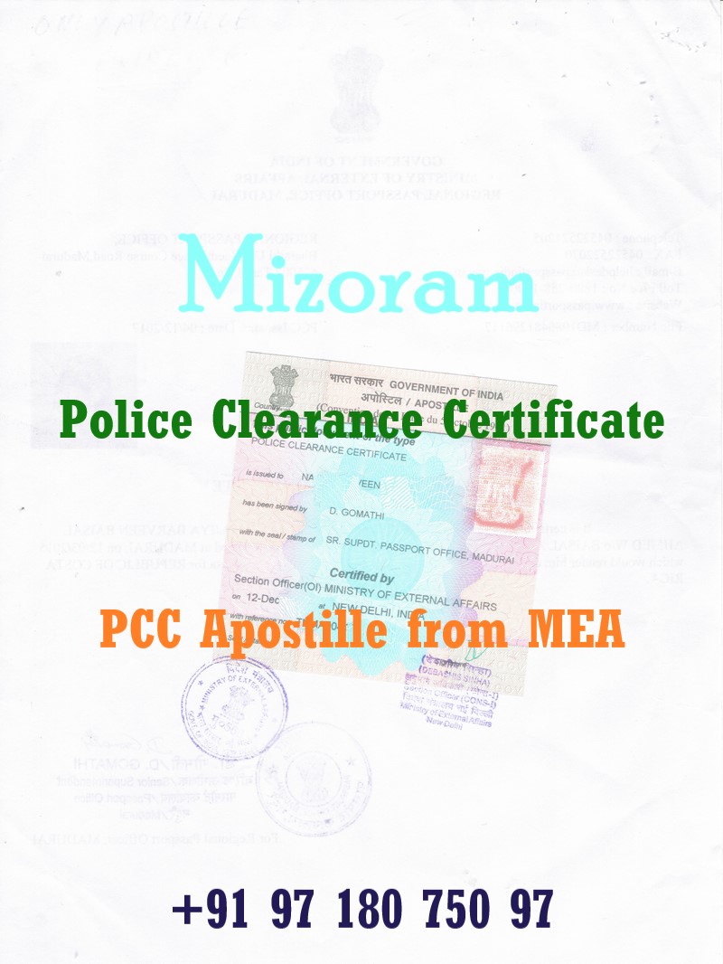 A Police Clearance Certificate (PCC) also known as No Criminal Record Certificate issued in Mizoram (Mizoram) is an important document required for immigration, employment abroad, long-term visas, residency permits, work permits, global background verification, and various foreign legal processes. To be legally accepted outside India, a Mizoram-issued PCC must be Apostilled by the Ministry of External Affairs (MEA), Govt. of India.
