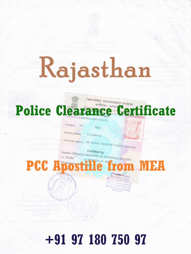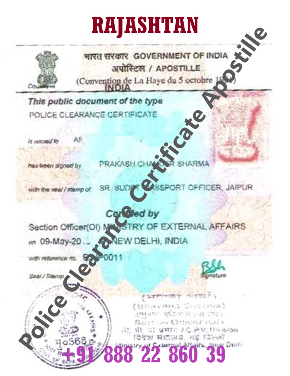 A Police Clearance Certificate (PCC) also known as No Criminal Record Certificate issued in Rajasthan (Rajasthan) is an important document required for immigration, employment abroad, long-term visas, residency permits, work permits, global background verification, and various foreign legal processes. To be legally accepted outside India, a Rajasthan-issued PCC must be Apostilled by the Ministry of External Affairs (MEA), Govt. of India.