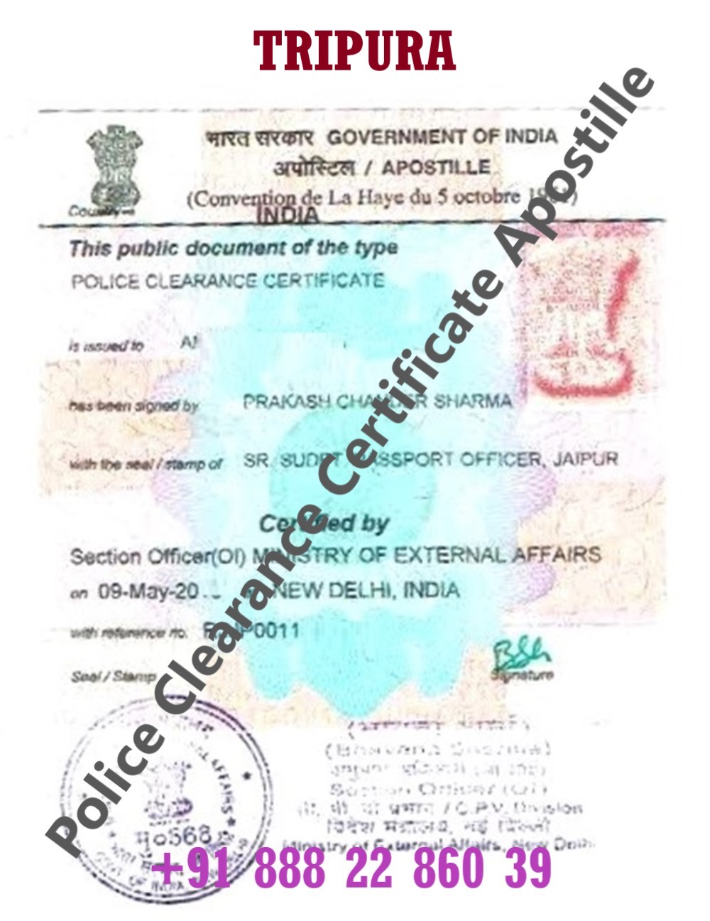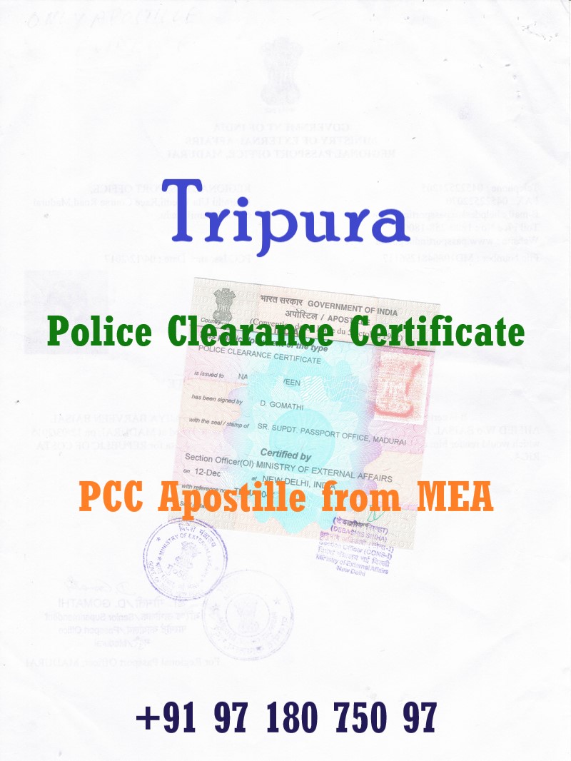 A Police Clearance Certificate (PCC) also known as No Criminal Record Certificate issued in Tripura (Tripura) is an important document required for immigration, employment abroad, long-term visas, residency permits, work permits, global background verification, and various foreign legal processes. To be legally accepted outside India, a Tripura-issued PCC must be Apostilled by the Ministry of External Affairs (MEA), Govt. of India.