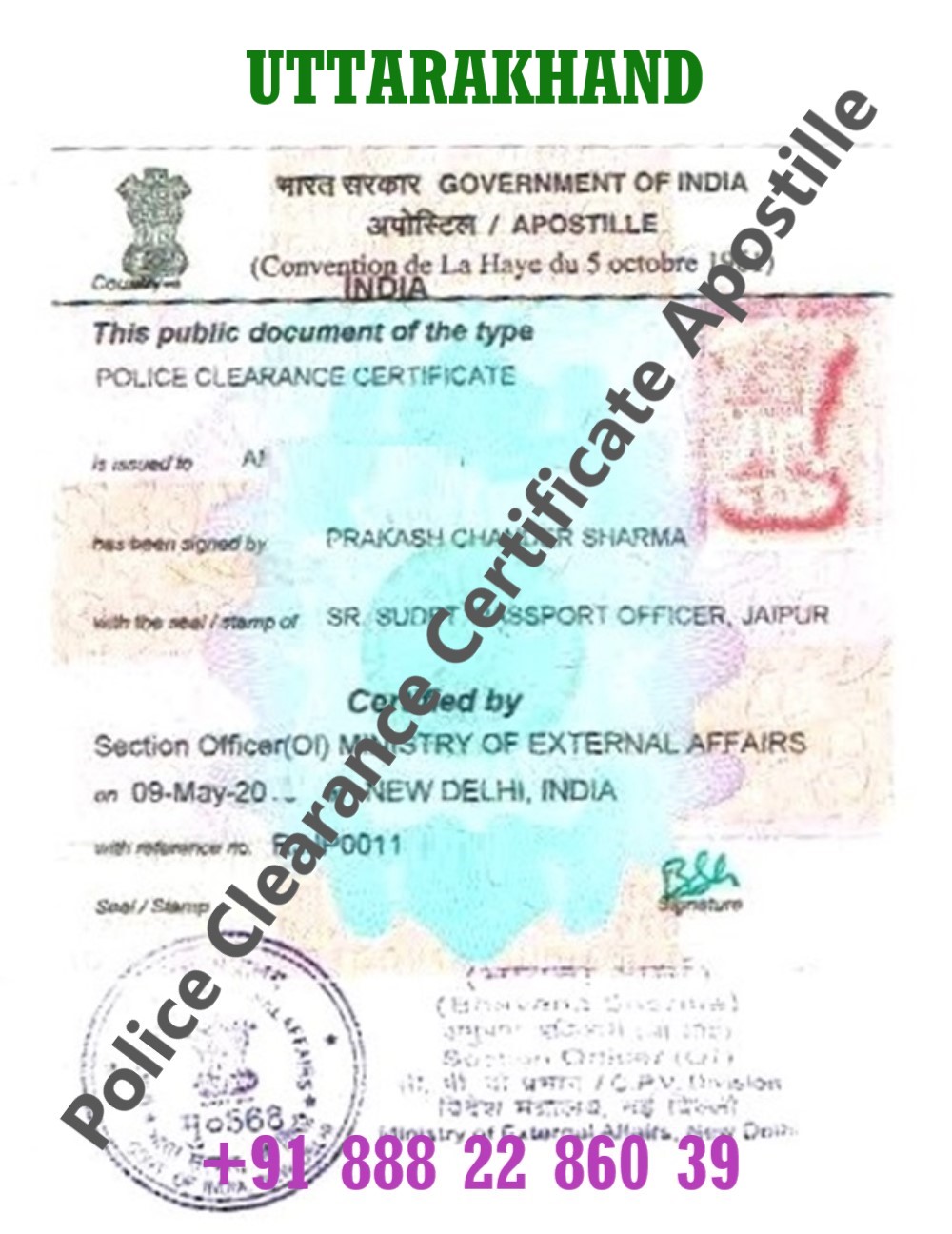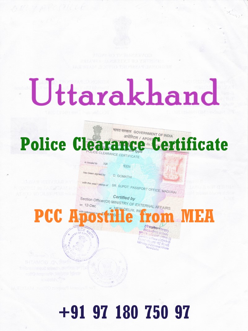 A Police Clearance Certificate (PCC) also known as No Criminal Record Certificate issued in Uttarakhand (Uttarakhand) is an important document required for immigration, employment abroad, long-term visas, residency permits, work permits, global background verification, and various foreign legal processes. To be legally accepted outside India, a Uttarakhand-issued PCC must be Apostilled by the Ministry of External Affairs (MEA), Govt. of India.
